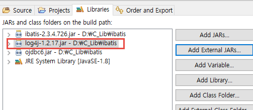 📝 Log4J를 적용하기 위해서 먼저 jar 파일을 Log4J를 적용할 폴더에 Build Path를 해줍니다.