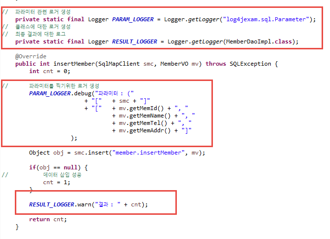 아래 사진은 member.xml 내 쿼리를 수행하기 전, 데이터를 세팅하는 DAO에 설정된 로거입니다.