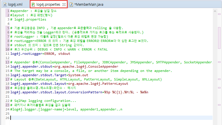 위의 log4J.properties에서 설정된 기본 로그 출력 레벨은 ERROR입니다.