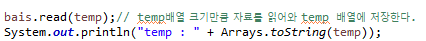 bais.read(temp)๋ฅผ ํ๋ฉด ์ด ๋ฉ์๋์ ๋ฐํ๊ฐ์ ์ค์ ์ฝ์ด์จ byte ์๋ฅผ ๋ฐํํฉ๋๋ค.