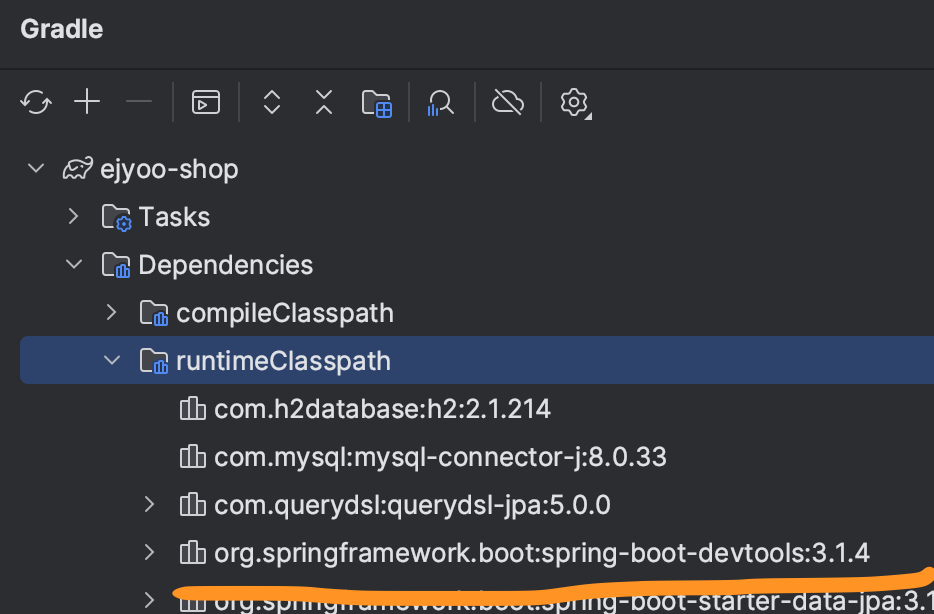 의존성을 설정한 뒤 Gradle 컴파일러에서 획득한 runtimeClasspath 에 추가한 devtools가 있는지 확인한다.